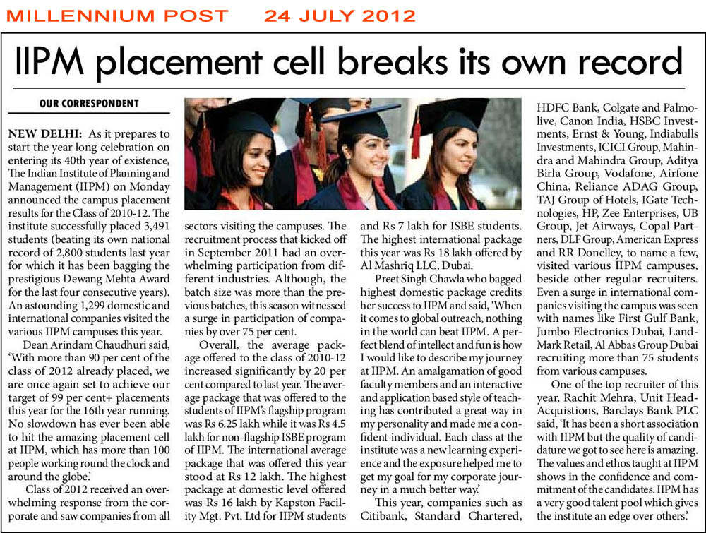 IIPM placement cell breaks its own record - Millennium Post - 24 July 2012 | News and Events